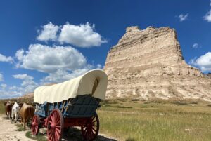 Immerhin hatte das den Vorteil, dass wir früher in Gering ankamen. In der Nachbarschaft liegt Scotts Bluff National Monument, das einerseits eine Landmarke ist (bluff bedeutet so viel wie Klippe), andererseits eine Art Denkmal. An dieser Stelle mussten die Siedler des Oregon Trails das Gebirge überqueren, was zur damaligen Zeit nicht ganz einfach war. Noch heute zeugen die tiefen Rillen im Gestein von den Planwagen, die den Berg hinauf- und wieder heruntergerumpelt sind. Wir benutzten dafür eine ? wunderbar asphaltierte und gut ausgebaute ? Straße, um vom Berggipfel einen Blick auf das prosperierende Städtchen Scottsbluff zu werfen. Hatte ich eigentlich schon erwähnt, dass die Namensgebung hier nicht sehr einfallsreich ist?