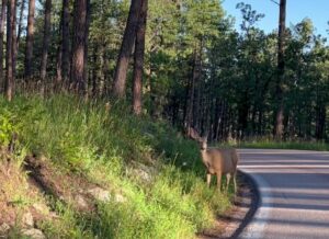 Unser erstes Ziel war die Wildlife Loop Road im State Park, die durch offene Prärie führt, auf der zahlreiche Wildtiere leben. Das erste Reh tauchte bereits kurz vor der Parkeinfahrt auf ? und sollte für eine ganze Weile unsere einzige Begegnung mit einem> Wildtier bleiben. Hatten die Tiere sich von der Straße zurückgezogen? Und waren wir vergeblich so früh aufgestanden, um sie zu sehen? Doch zuletzt tauchten sie doch noch auf, zuerst einige Gabelböcke, die vor unserem> Wagen die Straße überquerten, dann trafen wir auf eine Gruppe Bisons, die ebenfalls gerade die Straßenseiten wechselten, und bevor wir den Park wieder verlassen haben, sahen wir noch eine riesige Kolonie von Präriehunden. Insgesamt ein em>pfehlenswerter Abstecher.