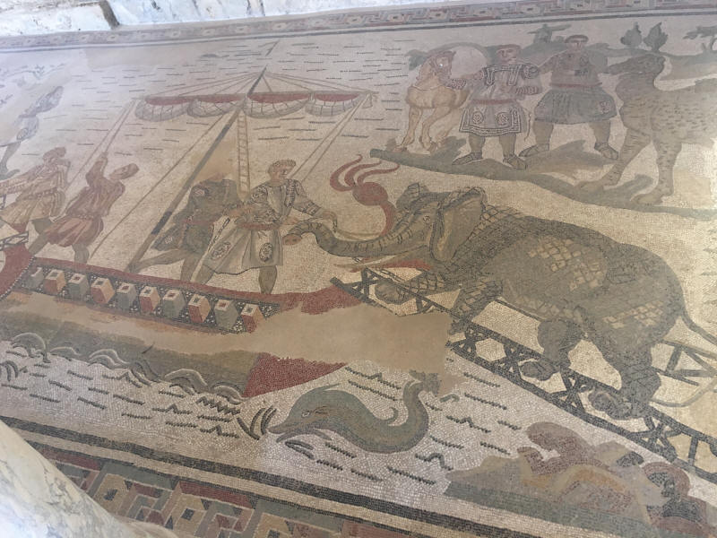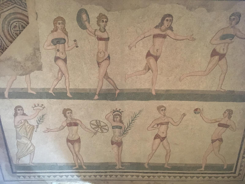 Erste Station war die Villa Romana del Casale, eine römische Villa aus dem> 4. nachchristlichen Jahrhundert, die Mitte des letzten Jahrhunderts ausgegraben wurde. Berühmt ist sie für ihre wunderschönen Mosaike, die man unbedingt gesehen haben sollte. Leider steht man mit diesem> Wunsch nicht alleine da, denn es wimmelte nur so von Touristen und ganzen Gruppen, die in Bussen angereist waren. Immerhin bekamen wir, eingepfercht zwischen einer italienischen und einer amerikanischen Gruppe, so in den Genuss einer kostenlosen Führung ?