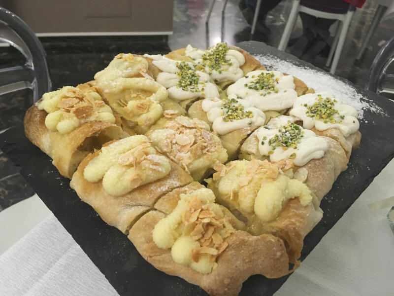 Wegen der Hitze starteten wir diesmal mit einem> Frühstück der sizilianischen Art in den Tag: Es gab Granita mit Brioche. Meine Lieblingssorte ist bislang Pfirsich, und unser Caf? mischt sogar ganze Fruchtstücke mit hinein, was diesem> eiskalten Vergnügen den letzten Kick gibt. Neugierig geworden, was sie sonst noch an Leckereien anbieten, haben wir uns ein paar kleine Gebäckteile besorgt, die wie winzige Eiswaffeln aussehen und mit einer Art Sahnecrem>e gefüllt sind, die dann noch in Kuvertüre getaucht wird. Die Geschmacksrichtungen, die wir probiert haben, waren weiße Schokolade, Mandel und Zitrone; alle drei sind zu em>pfehlen.
