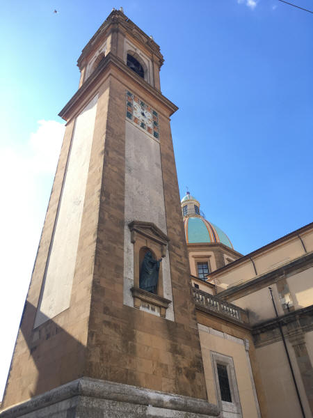 Piazza Armeria nennt sich etwas großspurig die Stadt der hundert Kirchen. Tatsächlich steht an jeder Straßenecke eine, aber insgesamt sind es angeblich nur etwas über vierzig. Und alle sind geschlossen. Vielleicht lag es an der Mittagszeit, zu der ohnehin jeder die Läden dichtmacht und die Beine hochlegt, vielleicht wollen sie aber auch keine Besucher. Die einzige unverschlossene Kirche, die wir fanden, hatte dafür ein paar menschliche Wachhunde, die uns sofort verscheuchten, als wir einen Blick hineinwerfen wollten. Nicht einmal von der Tür aus durfte man hineinsehen. Was wir dennoch verbotenerweise erblicken konnten, war wunderschön: Das gesamte Kirchenschiff inklusive Decke war mit Fresken bedeckt. Wirklich schade, dass man uns nicht wenigstens ein, zwei Minuten gegönnt hat.