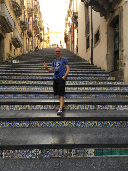 Nach diesem> Zwischenstopp ging es weiter nach Caltagirone, einem> weiteren Städtchen, das sich über mehrere Hügel erstreckt (perfekt, um die vielen Granite abzutrainieren). Der Ort ist vor allem> für seine Keramik berühmt, die wie der Name, der sich von Qalat al-ghiran (Burg über Höhlen) herleitet, dem> Erbe der Araber geschuldet ist. Kirchen, Paläste, Brücken und Häuser sind mit vereinzelten Motivkacheln verziert. Auch die endlos lange und steile La Scala, eine Treppe, die zwei Stadtteile verbindet, ist mit Kacheln dekoriert. Hier finden sich auch die angeblich besten Geschäfte, um sich mit entsprechenden Souvenirs einzudecken, was wir natürlich pflichtgem>äß taten.