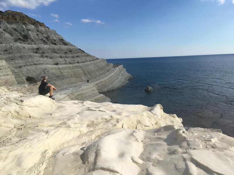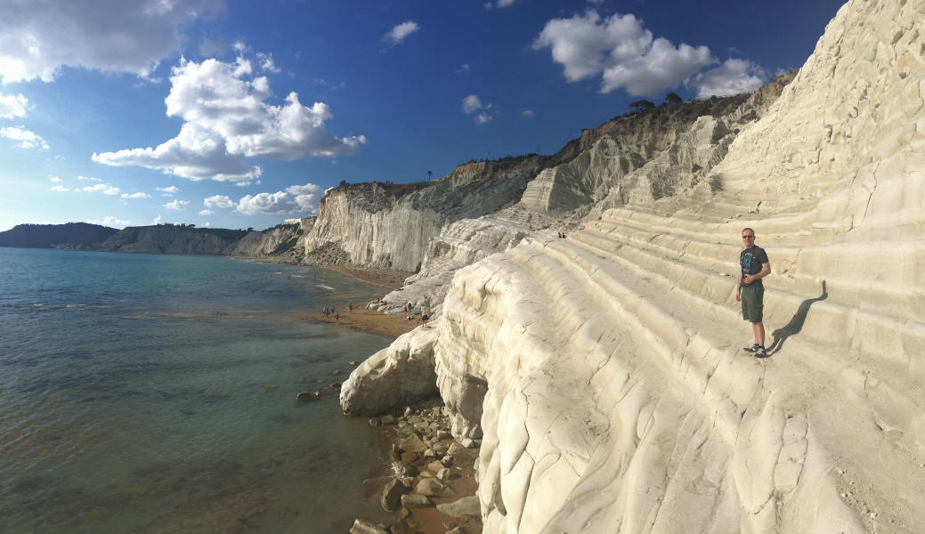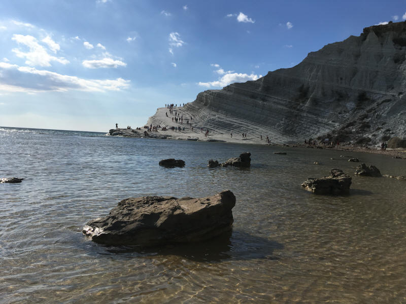 Um uns zu belohnen ging es nach so viel Kultur noch an den Strand. Die Scale dei Turchi, die Türkentreppe, liegt nur wenige Kilometer von Agrigento entfernt und ist ein beliebtes Ausflugsziel. Im Sommer dürfte an diesem> abgelegenen Küstenabschnitt die Hölle los sein, jetzt war es ?nur? völlig überlaufen. Menschen krabbelten wie Ameisen die Kalksteinfelsen hinauf, um von dort einen spektakulären Blick auf die wild-romantische Küste zu werfen, lagen am Strand oder wateten ins flache und unglaublich warme Wasser hinaus. Es war einfach nur großartig.