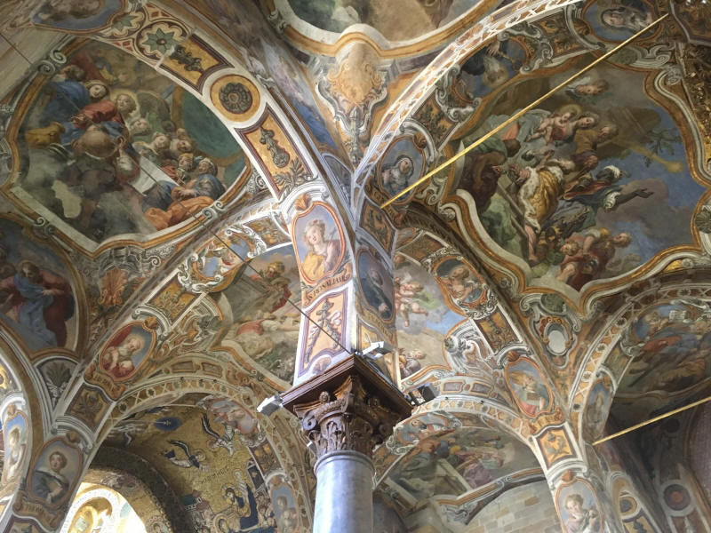 Unbedingt ansehen sollte man sich La Matorana und das winzige Kirchlein San Cataldo, das in direkter Nachbarschaft liegt, denn beide unterscheiden sich stark von den hier üblichen, völlig überladenen Barockkirchen. Diese sind zwar wunderschön, manchmal auch ein wenig kitschig, vor allem> aber ein Generalangriff auf unsere Sehnerven: Tausende Putti tummeln sich hier an den Wänden und Decken, krabbeln die Ecken und Säulen hinauf oder belagern die üppigen Gem>älde, Madonnen wirken zwischen all den verschnörkelten Säulen auf ihren Altären regelrecht verloren, und vom Betrachten der opulenten Deckenfresken bekommt man einen steifen Nacken. Es ist der barocke Overkill.