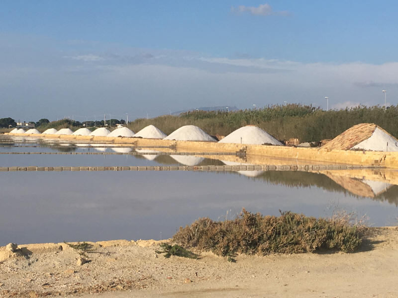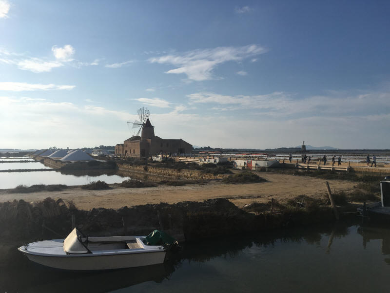 Der Rückweg führte uns über die Via del Sale, die Salzstraße, nach Norden. Unterwegs hielten wir an einer Saline an, um uns die in der Sonne glitzernden Becken anzusehen, in denen Wasser verdunstet und Meersalz gewonnen wird. Gerne hätten wir uns eine der pittoresken Windmühlen näher angesehen, doch leider war das nicht möglich. Dafür konnte man Salz verkosten, was eine seltsame Erfahrung war und auf Dauer recht durstig machte. Natürlich konnte ich nicht widerstehen und habe mir neben einer Packung grobem> Meersalz auch noch ein mit Orangen und diversen Pfeffersorten aromatisiertes Salz gekauft. Keine Ahnung, wozu ich das jem>als brauchen werde ?