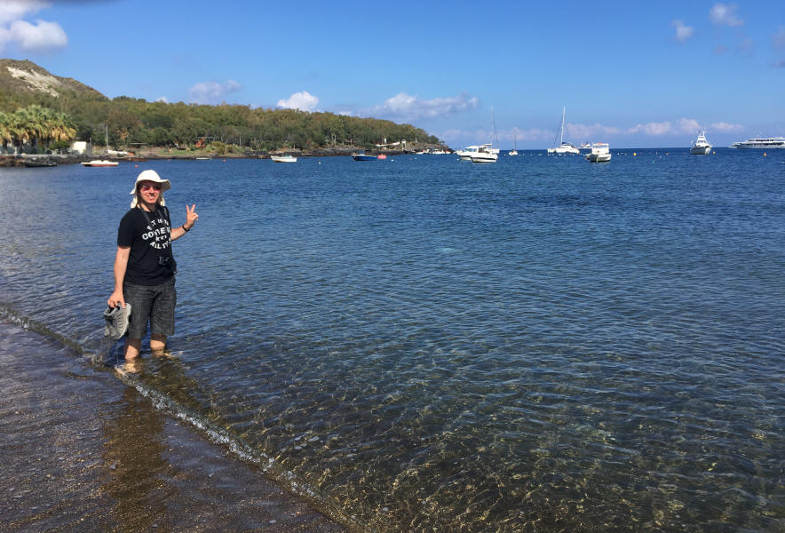 Man kann die Leute dennoch gut verstehen: Die Landschaft ist traumhaft schön, verfügt über tolle Strände (sie sind schwarz und der Sand kitzelt, wenn man ihn überquert), das Wasser ist glasklar und von einem> unglaublichen Kobaltblau. Ein Paradies. Nur eben eines, das von chaotischen Italienern betrieben wird und das man sich mit Tausenden Urlaubern aus ganz Europa teilen muss. Schlammbaden kann man auf Vulkan übrigens auch, was gut für die Haut sein soll, die Menschen aber aussehen lässt wie Wasserleichen, weil der Schlamm sehr hell und kalkartig ist. Da wir keine Badehosen dabei hatten, mussten wir auf diese Erfahrung leider verzichten, aber dafür sind wir ein bisschen durchs flache Wasser gewatet.
