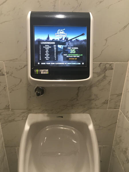 Die Männerklos besitzen etwas, das so absurd ist, dass man es schon wieder cool finden kann: Urinale, die gleichzeitig Videospiele sind. Im Grunde muss man gegnerische Panzer abschießen, die auf dem> Bildschirm über dem> Becken auftauchen, indem> man den Strahl im Urinal in die entsprechende Richtung lenkt. Total gaga, macht aber Spaß und hebt das Wettpinkeln auf eine völlig neue Ebene.