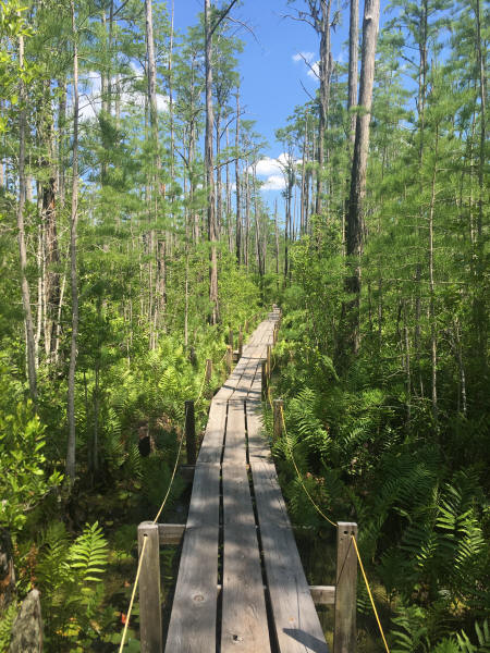 Der Okefenokee Swamp Park, den wir uns zur Erforschung der heimischen Flora und Fauna ausgesucht hatten, liegt etwas abseits tief im Süden Georgias, dicht an der Grenze zu Florida. Auf dem> Weg dorthin sahen wir kein weiteres Fahrzeug, dafür warteten dann auf dem> Parkplatz gleich drei Schulbusse. Im Sommer ist hier bestimmt die Hölle los, aber so kurz vor den großen Ferien hielt sich der Andrang noch in Grenzen.