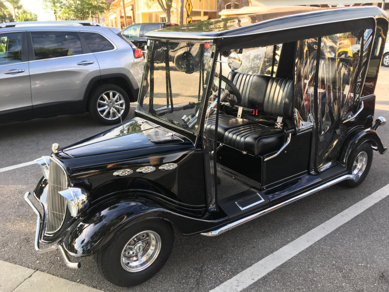 Am Auffälligsten sind die Straßen, die neben der eigentlichen Fahrbahn noch eine separate für Golfcarts aufweisen, die das beliebteste Fortbewegungsmittel hier darstellen. Es gibt ? leider habe ich nicht die aktuellsten Zahlen, so dass es inzwischen mehr sein könnten ? rund 50.000 Golfcarts in The Villages. Sie flitzen erstaunlich schnell durch die Straßen, und es gibt für sie eigene Tunnel und Unterführungen sowie Brücken, um die Autobahnen zu überqueren. Unsere Gastgeber haben eine Runde mit uns gedreht, und das hat großen Spaß gem>acht. Die meisten Fahrzeuge sehen wie normale Golfcarts aus, aber es gibt auch welche, die an Oldtimer erinnern, während andere Polizei- oder Feuerwehrwagen nachem>pfunden sind. Solche Sonderausführungen kosten dann auch rund 20.000 Dollar und mehr. übrigens hat jede Garage noch einen kleinen Anbau im selben Stil, in dem> die Golfcarts parken, was mich an Der Herr der Ringe denken ließ, da gab es auch alles eine Nummer kleiner für die Hobbits.