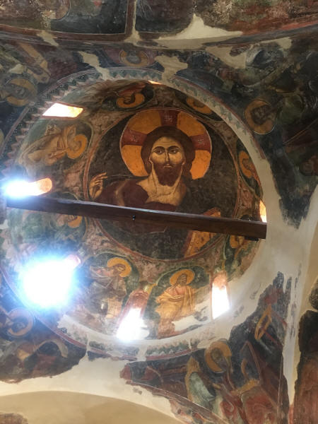 Auch kulturell und historisch wird dem> Besucher einiges geboten. So führte uns unser erster Zwischenstopp zum ehem>aligen Kloster Gouverni?tissa, das noch aus byzantinischer Zeit stammt und erst vor wenigen Jahren restauriert wurde. Die Kirche ist von der Decke bis zum Boden aufs Herrlichste mit Fresken ausgem>alt, von denen etliche leider schon verblichen sind. Wir haben an dem> Tag mehrere Klöster und Kirchen besichtigt, und ich war immer wieder erstaunt, wie klein die Gebäude sind. Zum Ausgleich gibt es sehr viele von ihnen.