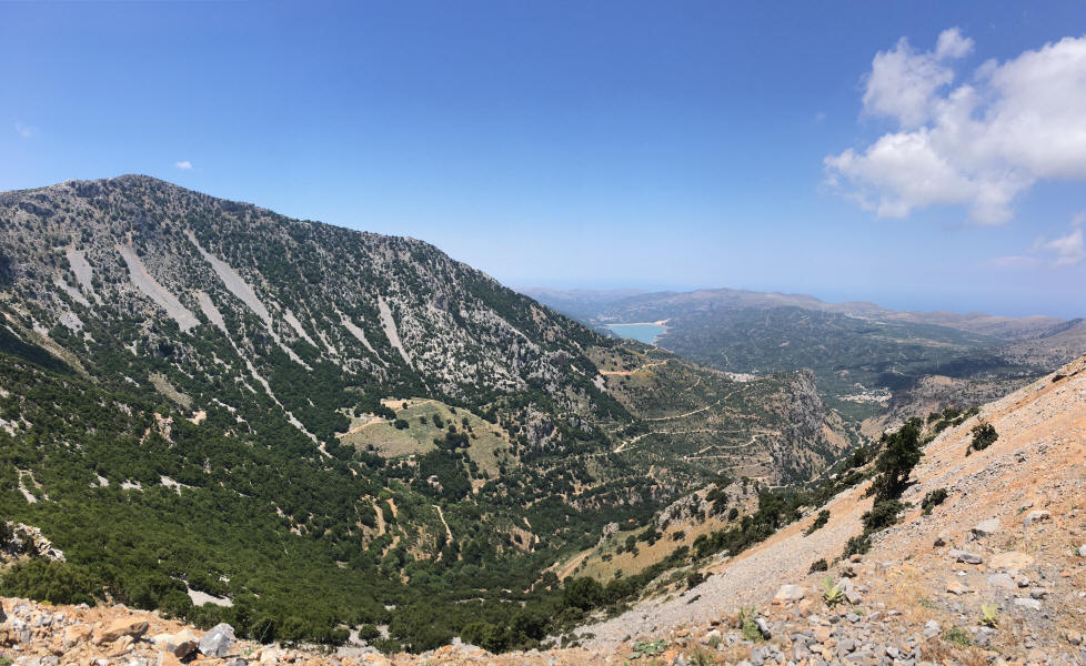 Die fruchtbare weite Ebene liegt über 800 Meter hoch und ist vom Dikti-Gebirge umgeben, dessen Gipfel teilweise über zweitausend Meter hoch sind. Um dorthin zu gelangen, muss man also sehr lange sehr steil bergauf fahren und viele enge Serpentinen in Kauf nehmen. Nichts für schwache Nerven und nervöse Mägen, aber landschaftlich sehr reizvoll.