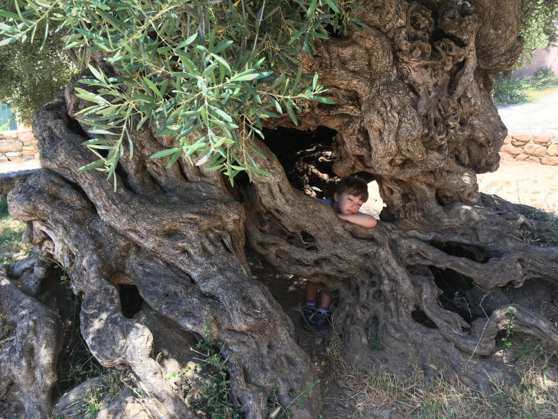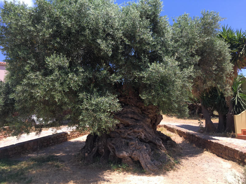 Vom Kloster aus, das direkt am Meer liegt, ging es hinauf in die Berge nach Ano Vouves, einem> winzigen, verschlafenen Dörfchen inmitten von Olivenhainen, das nicht weiter erwähnenswert wäre, stünde hier nicht einer der ältesten Olivenbäume der Insel. Experten haben aus dem> rund acht Meter dicken Umfang des Stammes errechnet, dass der Baum etwa dreitausend Jahre alt ist. Die Einheimischen behaupten gerne, dass er damit der älteste der Welt ist, aber im Osten der Insel, hinter den sieben Bergen, gibt es einen, der noch zweihundertfünfzig Jahre älter ist. Dem> Baum dürfte das vermutlich egal sein, nur sein erst zweitausendjähriger Bruder daneben ist beleidigt, weil ihm niem>and die gewünschte Aufmerksamkeit schenkt.
